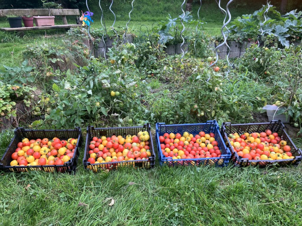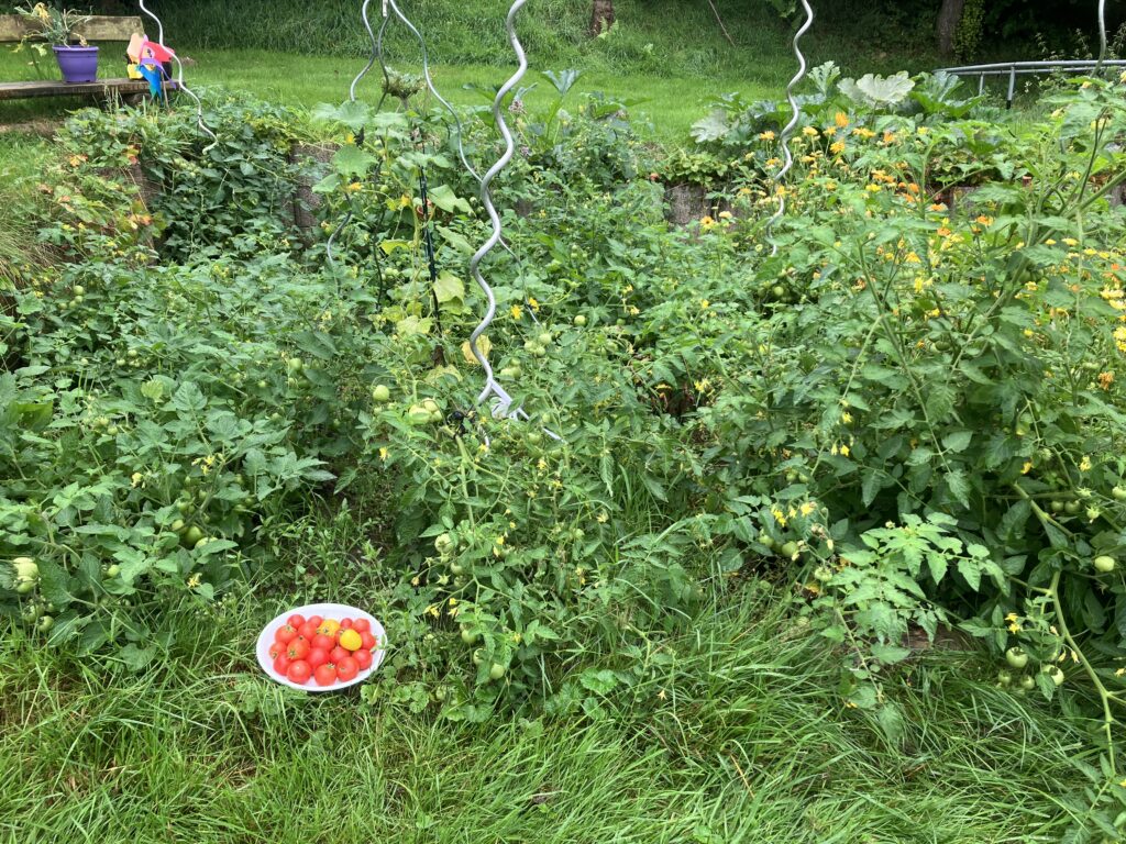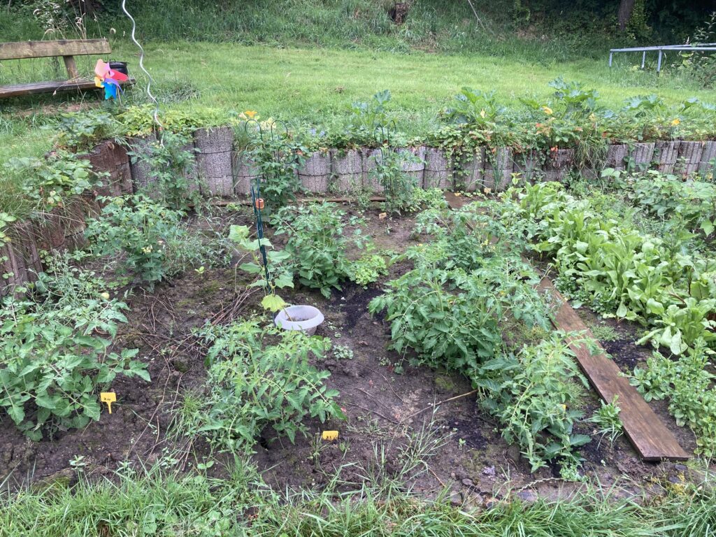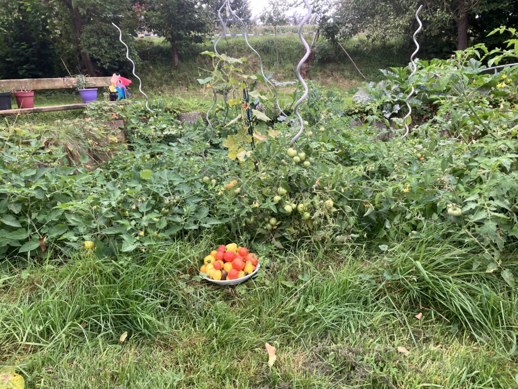 Familiengarten bei Osnabrück im nassen Jahr 2024. Nach Bedarf können kleine Mengen für ein Essen oder große Mengen für eine Feier oder zum Einkochen für den Winter geerntet werden.